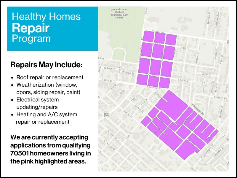 This program serves qualified low-income, owner-occupied households located within designated neighborhoods of the 70501 zip code.